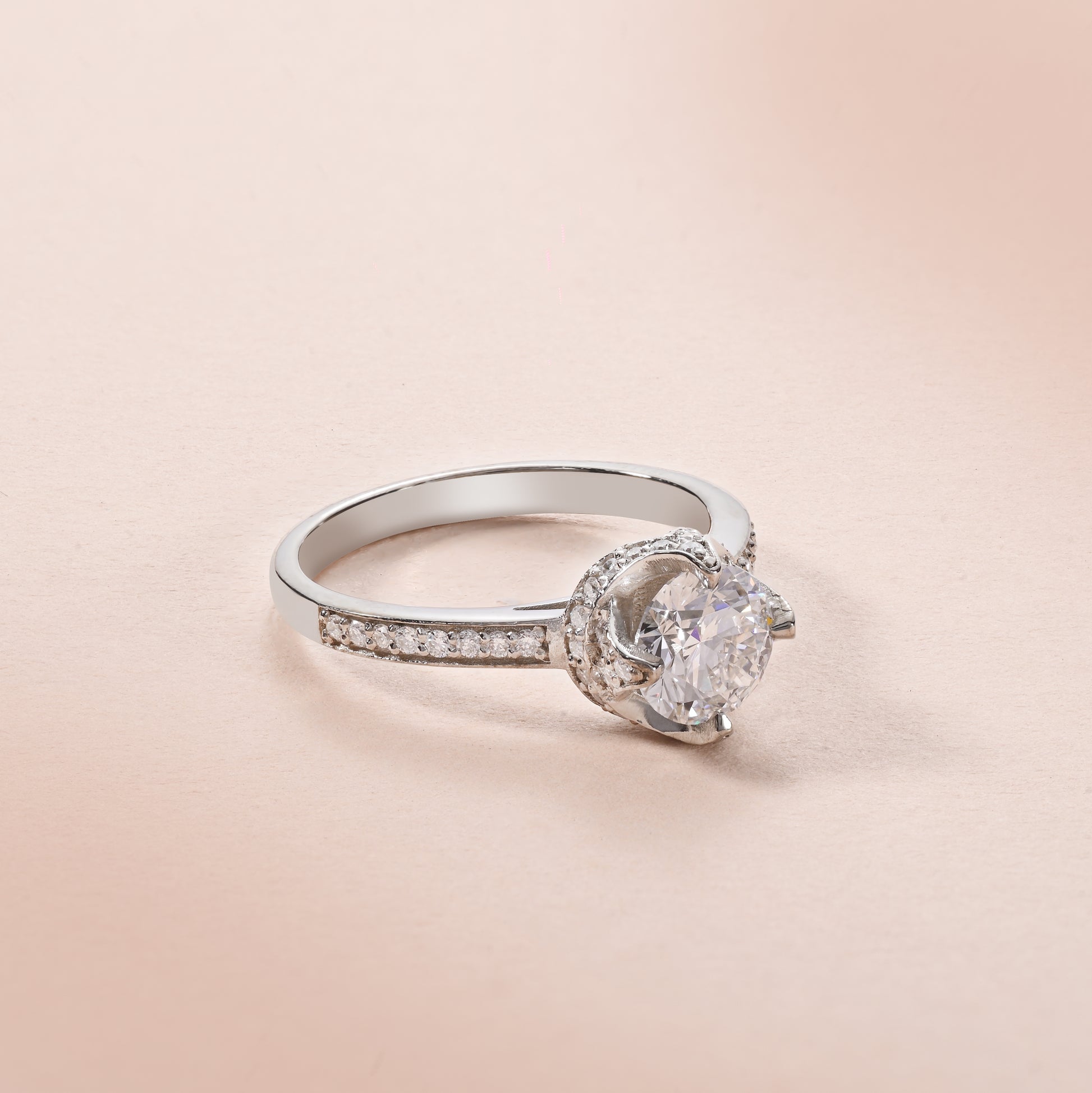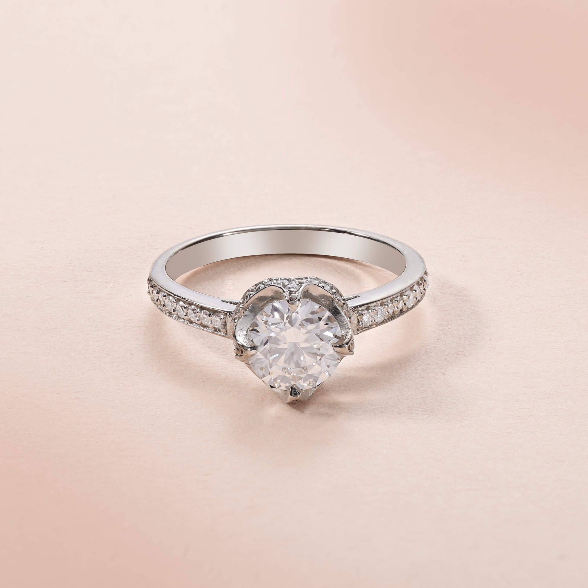 An elegant fusion of brilliance and craftsmanship, this ring features a stunning center diamond elevated in a cathedral setting. Gracefully arched diamond-set bridges form a halo beneath the stone, adding depth, sparkle, and architectural beauty to the design.