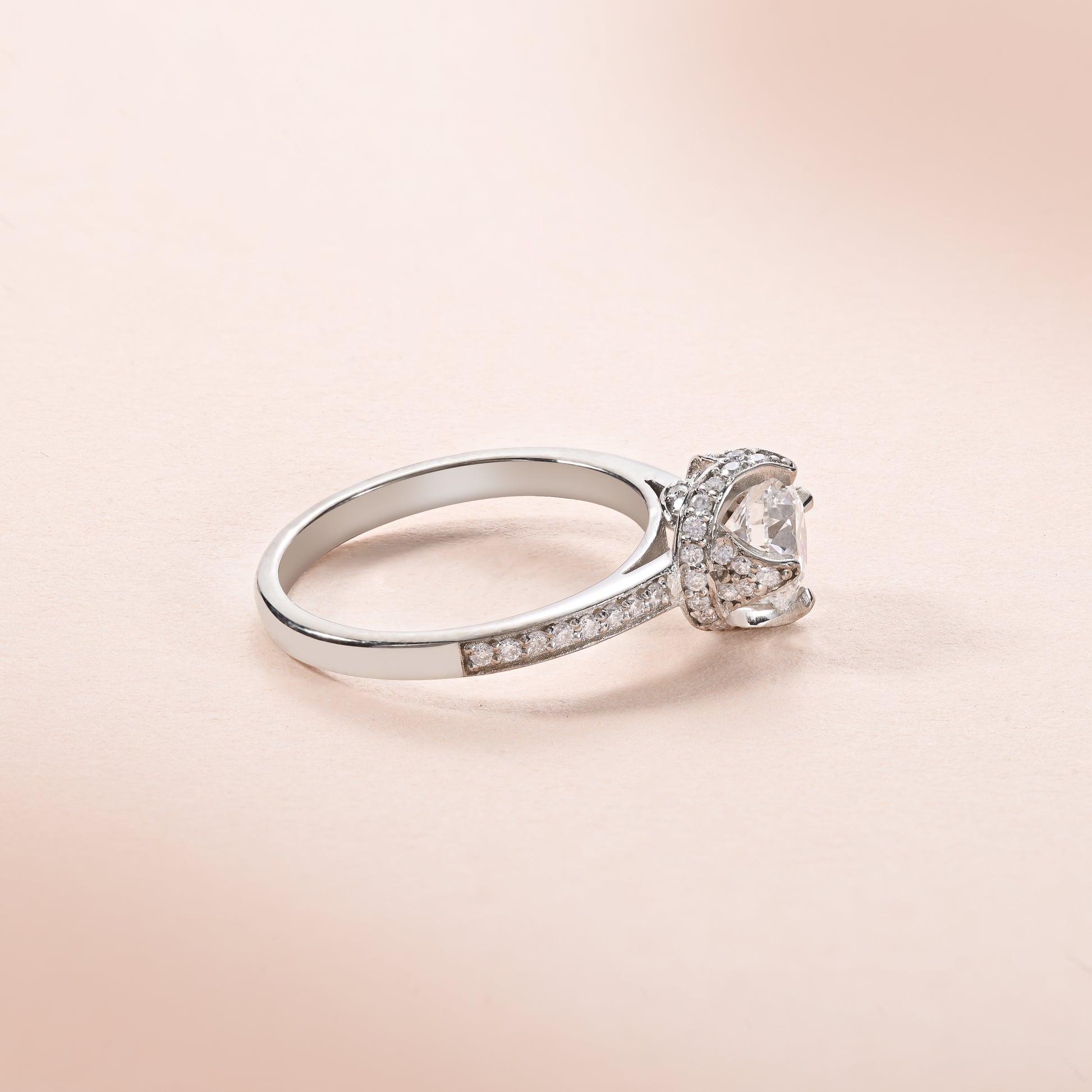 Special Feature: Elevated basket design with diamond-encrusted under-gallery for hidden sparkle.