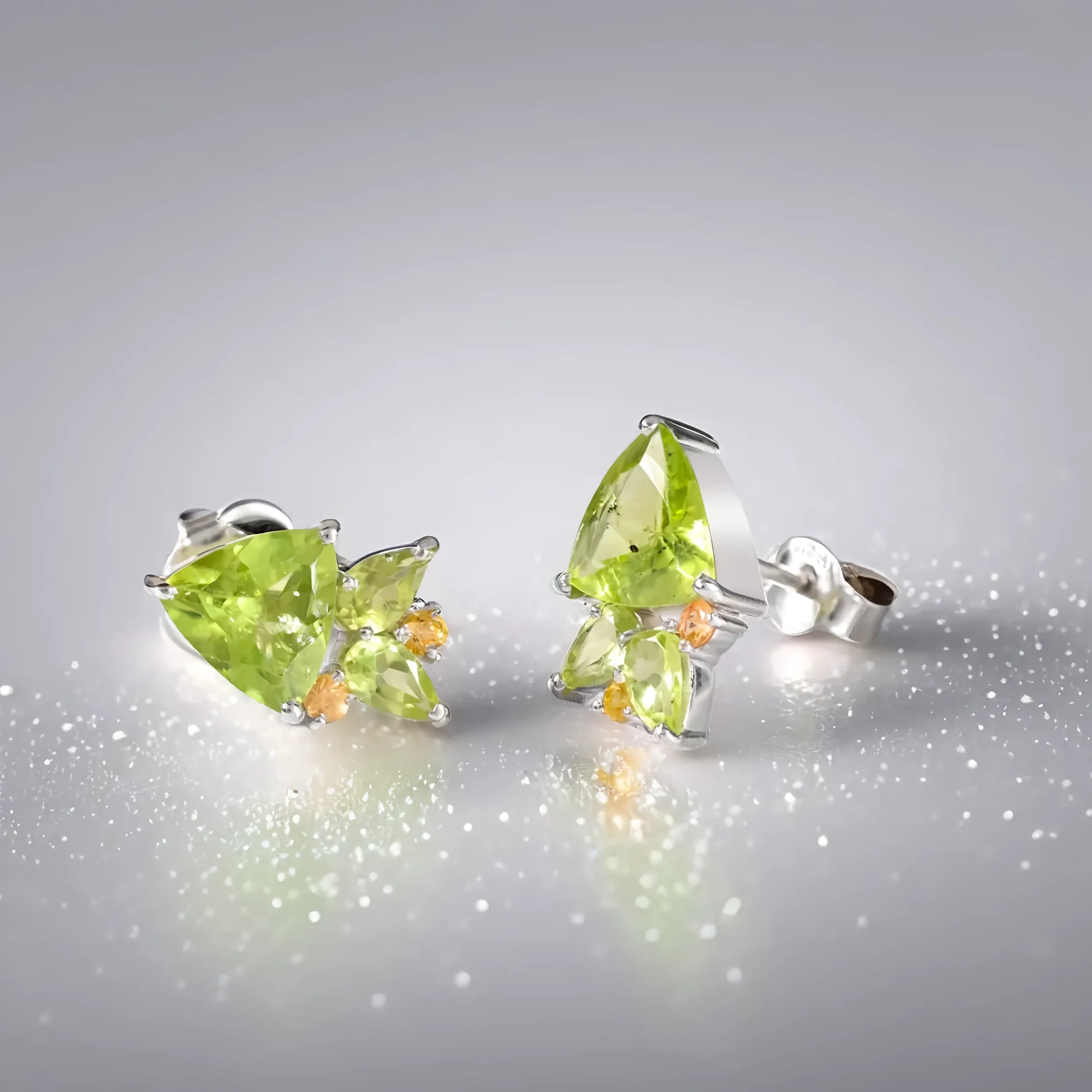 Trillion-cut Peridot studs accented with round yellow sapphires in a petal-inspired design, radiating elegance and vibrant charm.