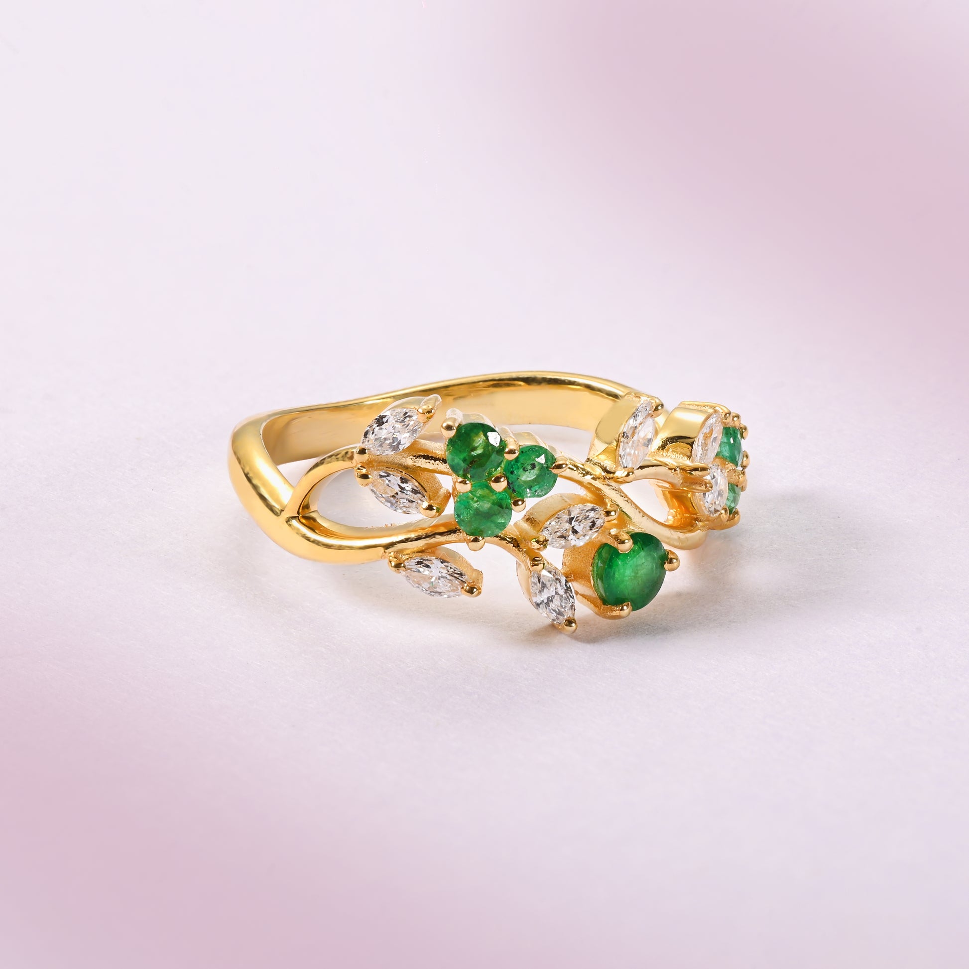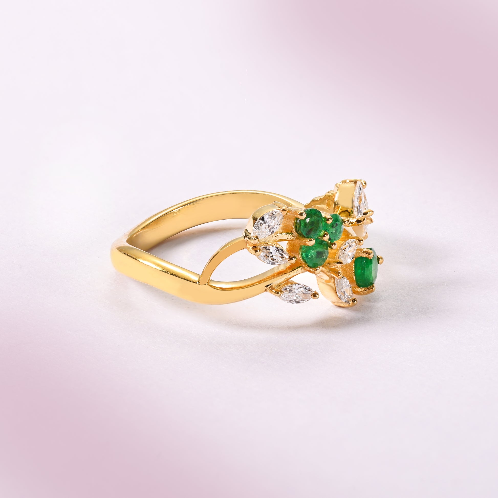 A nature-themed ring with glowing emerald-like stones and shimmering leaf accents.