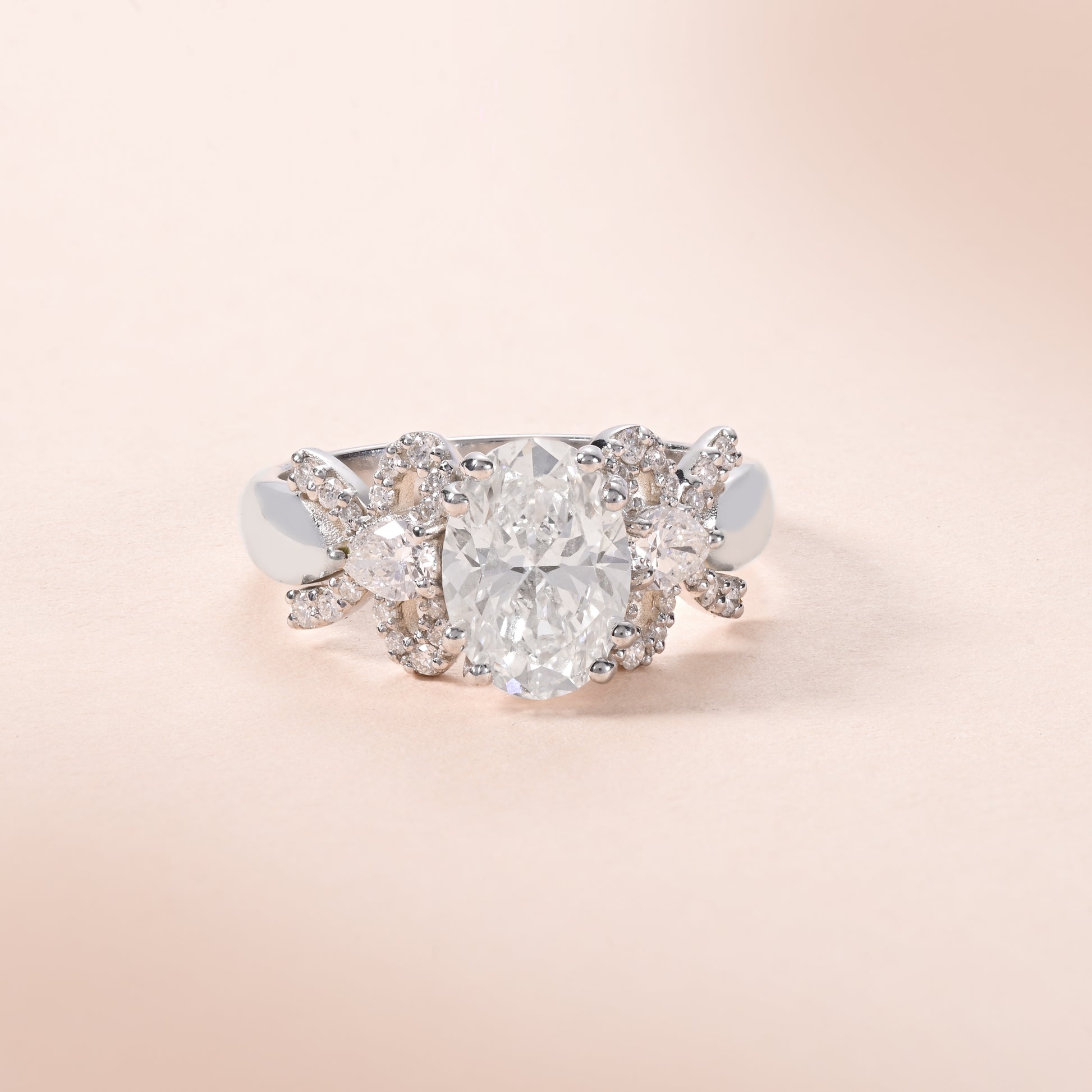 An elegant bow-inspired ring design featuring a dazzling oval center diamond gracefully accented with pear and round diamonds to form a sparkling bow motif.