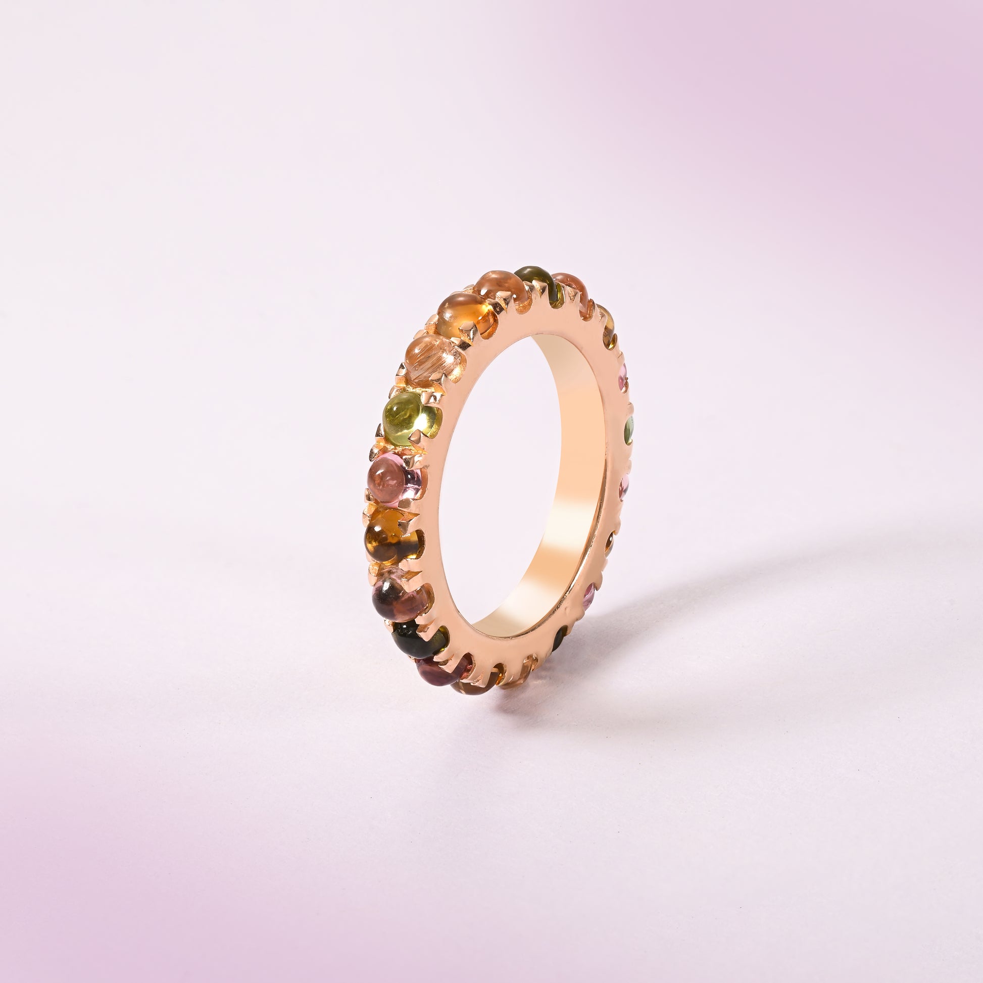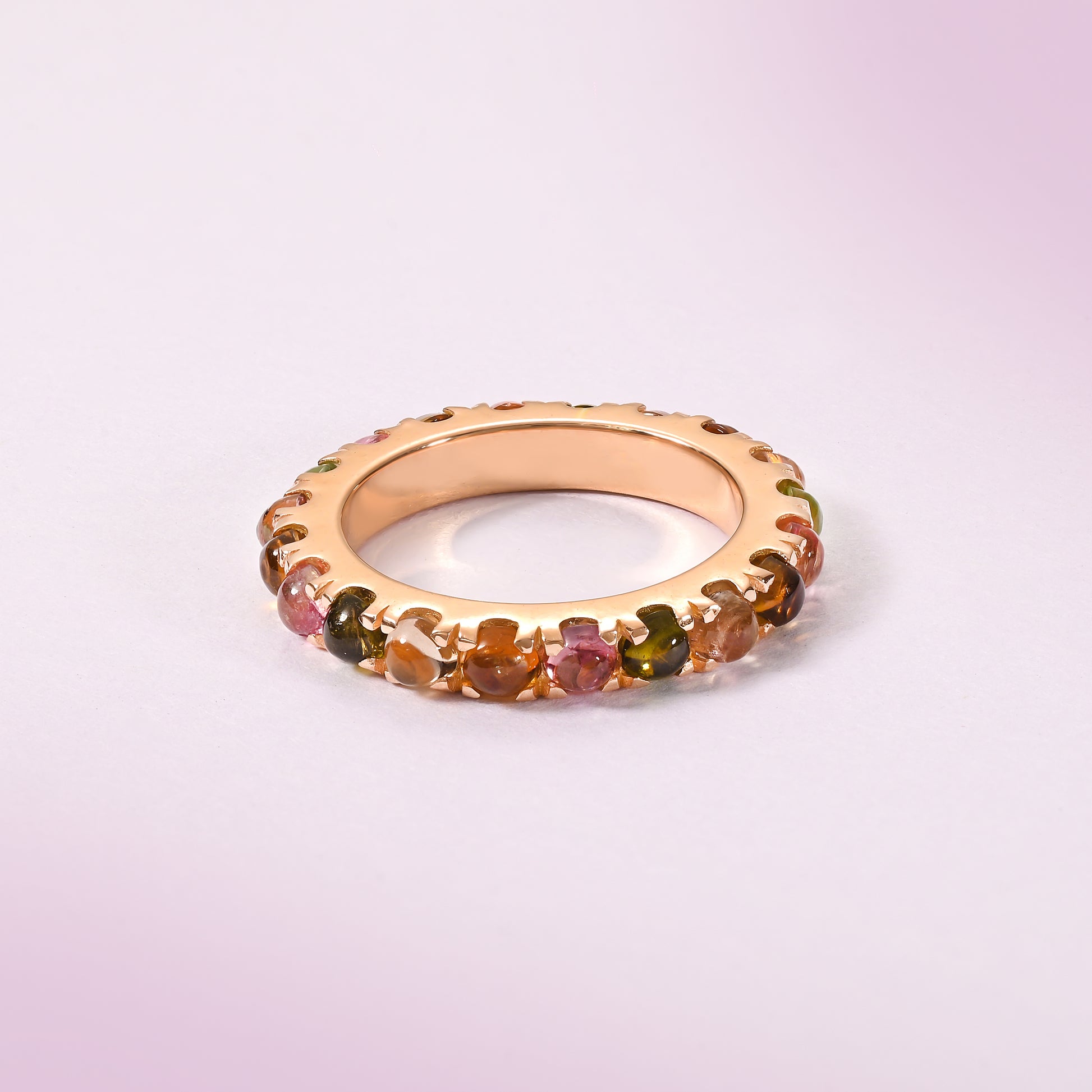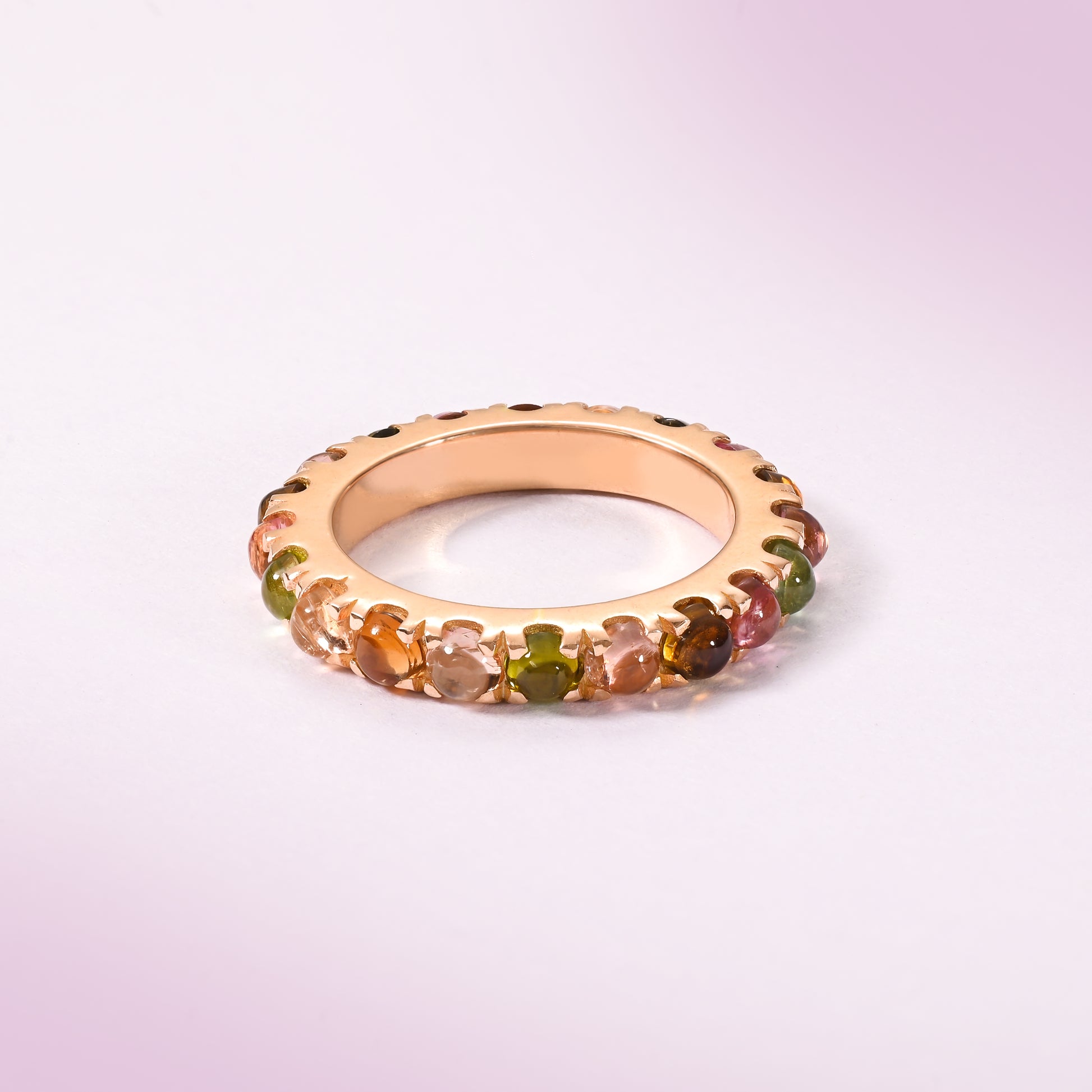 A stackable eternity band featuring natural tourmaline cabochons in a vibrant spectrum, designed for refined elegance and versatile wear.