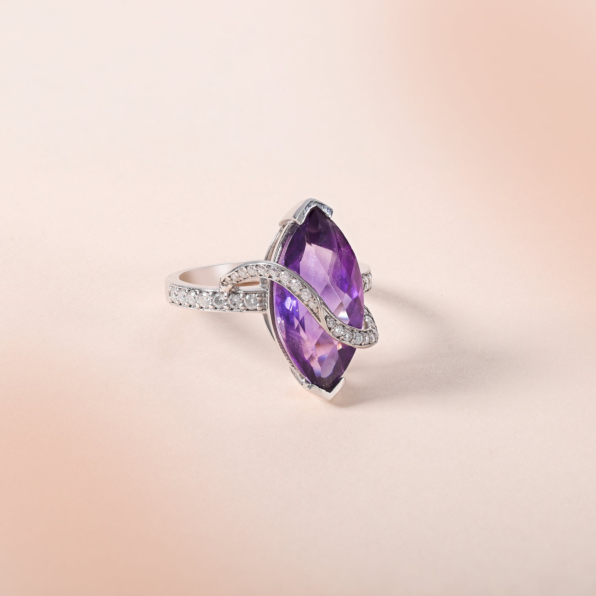 A statement of refined elegance, this ring showcases a vivid marquise-cut amethyst as its centerpiece, surrounded by a graceful wave of sparkling diamonds.